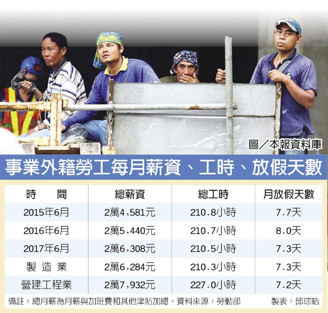 台灣目前約有67.7萬名產業與社福外籍勞工。勞動部昨(12)日公布最新調查數據顯示,事業面外籍勞工總薪資平均為2萬6,308元,至於外籍家庭看護工總薪資平均為2萬73元,雙雙創下近3年來的新高。 勞動部去年6月分別針對適用《勞基法》的事業面外籍勞工與不適用《勞基法》的外籍家庭看護工進行調查,發現事業外籍勞工總薪資平均為2萬6,308元,其中經常性薪資為2萬1,797元、占總薪資82.9%,加班費為3,989元。外籍家庭看護工總薪資平均為2萬73元,經常性薪資為1萬7,955元、占總薪資89.4%,加班費則為1,881元。 以工時來看,事業面外籍勞工總工時平均210.5小時,正常工時為180.3小時,加班工時為30.2小時,放假天數平均為7.3天,但外籍家庭看護工每日工作時間,雇主沒有規定者占8成2,不論雇主有無規定工作時間,每日實際工作時間平均約10小時,有9成5外籍家庭看護工每日連續休息時間超過8小時。 由於外籍家庭看護工不適用《勞基法》,未能強制7休1規定,但調查發現,假日都有放假或部分放假者占65.2%,假日不放假雇主都有發給加班費占9成7。 如果未來外籍家庭看護工在假日休假,也就是實施每7日休息1日,雇主有替代方案者占69.3%,主要替代方案以「由家人照顧」占91.0%為主。若政府補助雇主讓外籍家庭看護工於假日休假,雇主願意申請者占30.7%,願意負擔金額以「每日500元至未滿1,200元」占68.9%居多。 另外,事業雇主在管理、運用外籍勞工時曾遭遇過困擾者占42.2%,其中以「語言溝通困難」最高、占84.9%,其次為「衛生習慣不佳」、占36.4%;而家庭面雇主僱用外籍家庭看護工有困擾者占34.6%,困擾原因同樣也是以「語言溝通困難」占73.5%最高,「愛打電話、聊天」占39.3%居次。 發布單位 : 工商時報 邱琮皓 台北報導 發布日期 : 107-03-13