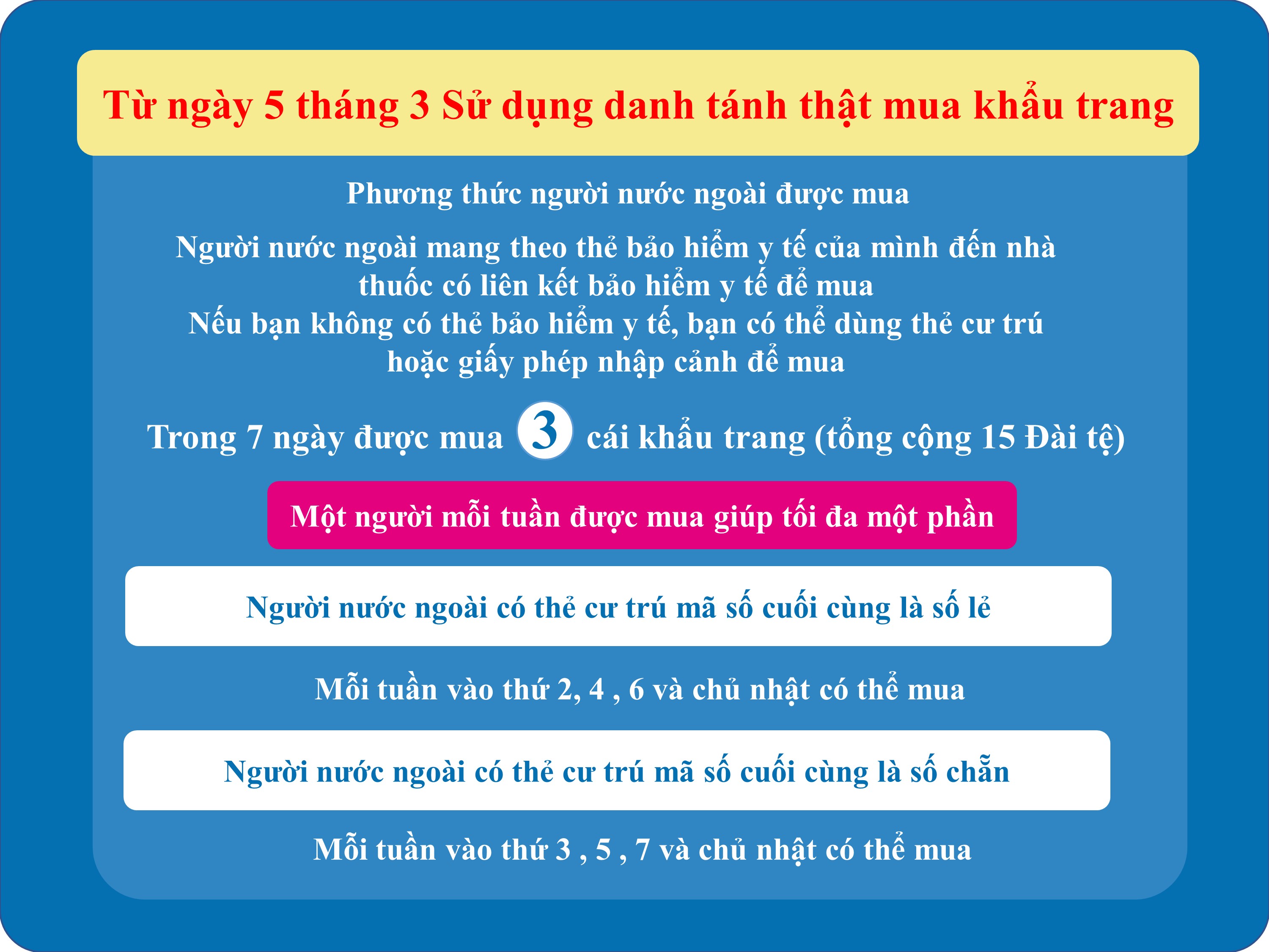 口罩販售實名制3月5日起 外籍人士購買方式 請持健保卡至健保特約藥局購買 未具健保加保資格者,請持居留證或入出境許可證購買 7天內可購買 3片口罩(共15元) 每人每週至多可代購1份 居留證末碼為單數的外國人 每週一、三、五、日 開放購買 居留證末碼為雙數的外國人 每週二、四、六、日 開放購買