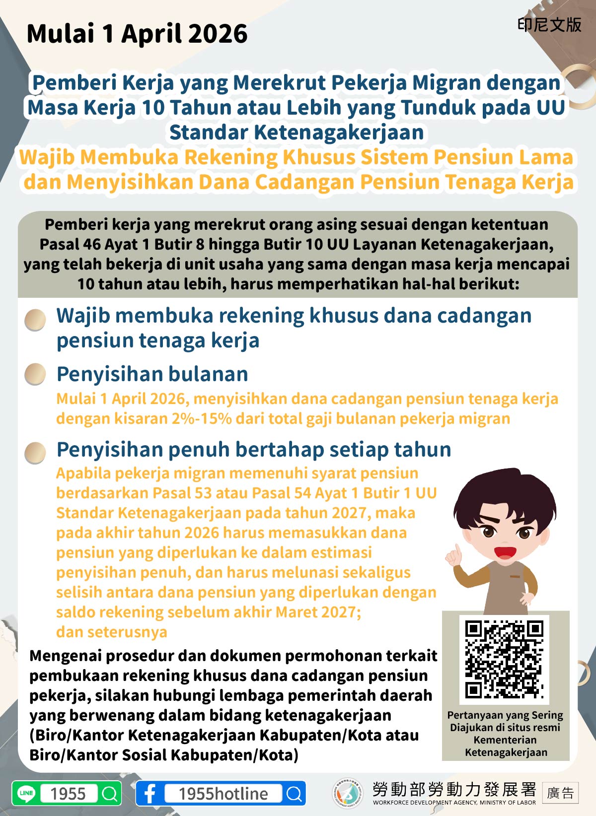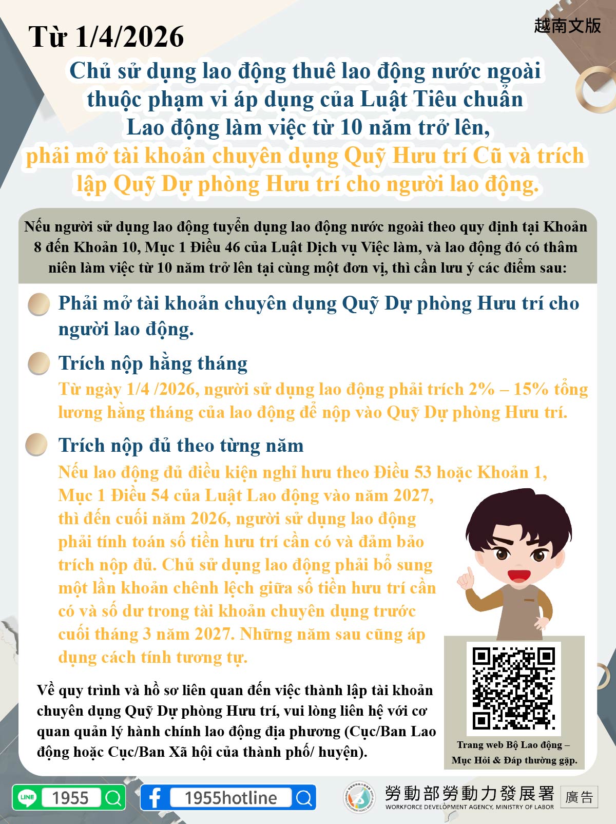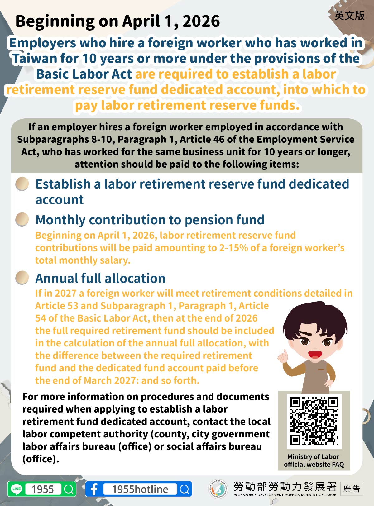 115年4月1日起,雇主聘僱年資達10年以上適用勞基法的移工應開立勞退舊制專戶、提撥勞工退休準備金 雇主如聘僱依就業服務法第46條第1項第8款至第10款規定,受僱於同一事業單位工作年資達10年以上之外國人,應注意下列事項 •應開立勞工退休準備金專戶 •按月提撥 : 自115年4月1日起,按移工每月薪資總額2%-15%範圍內,提撥勞工退休準備金 •逐年足額提撥 : 如果移工在116年成就勞基法第53條或第54條第1項第1款退休條件,115年底應將其所需退休金納入足額提撥估算,於116年3月底前一次補足其所需退休金與專戶餘額之差額;依此類推。 有關設立勞工退休準備金專戶相關申請流程及文件,請洽當地勞工行政主管機關(縣、市政府勞工局(處)或社會局(處)