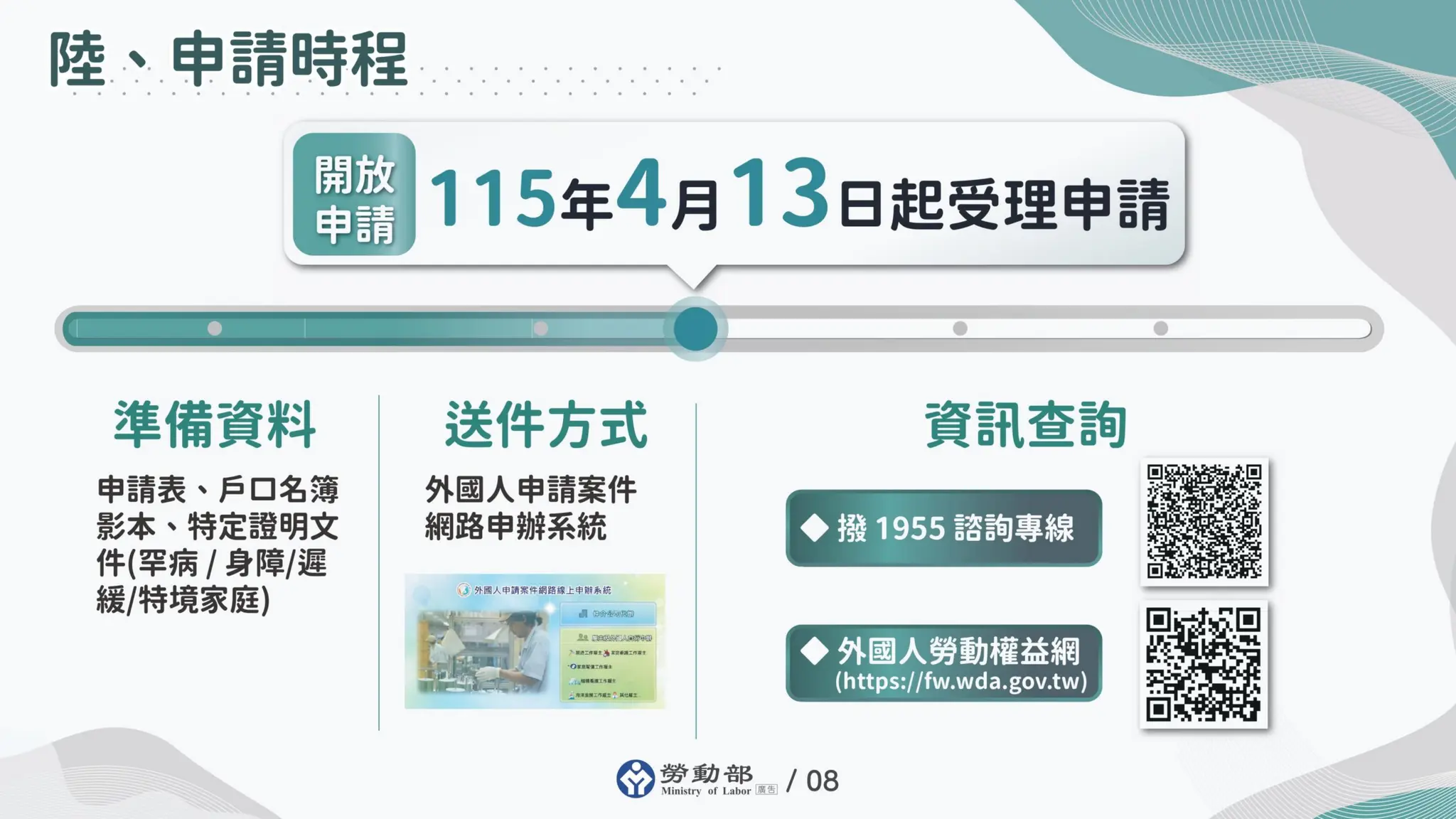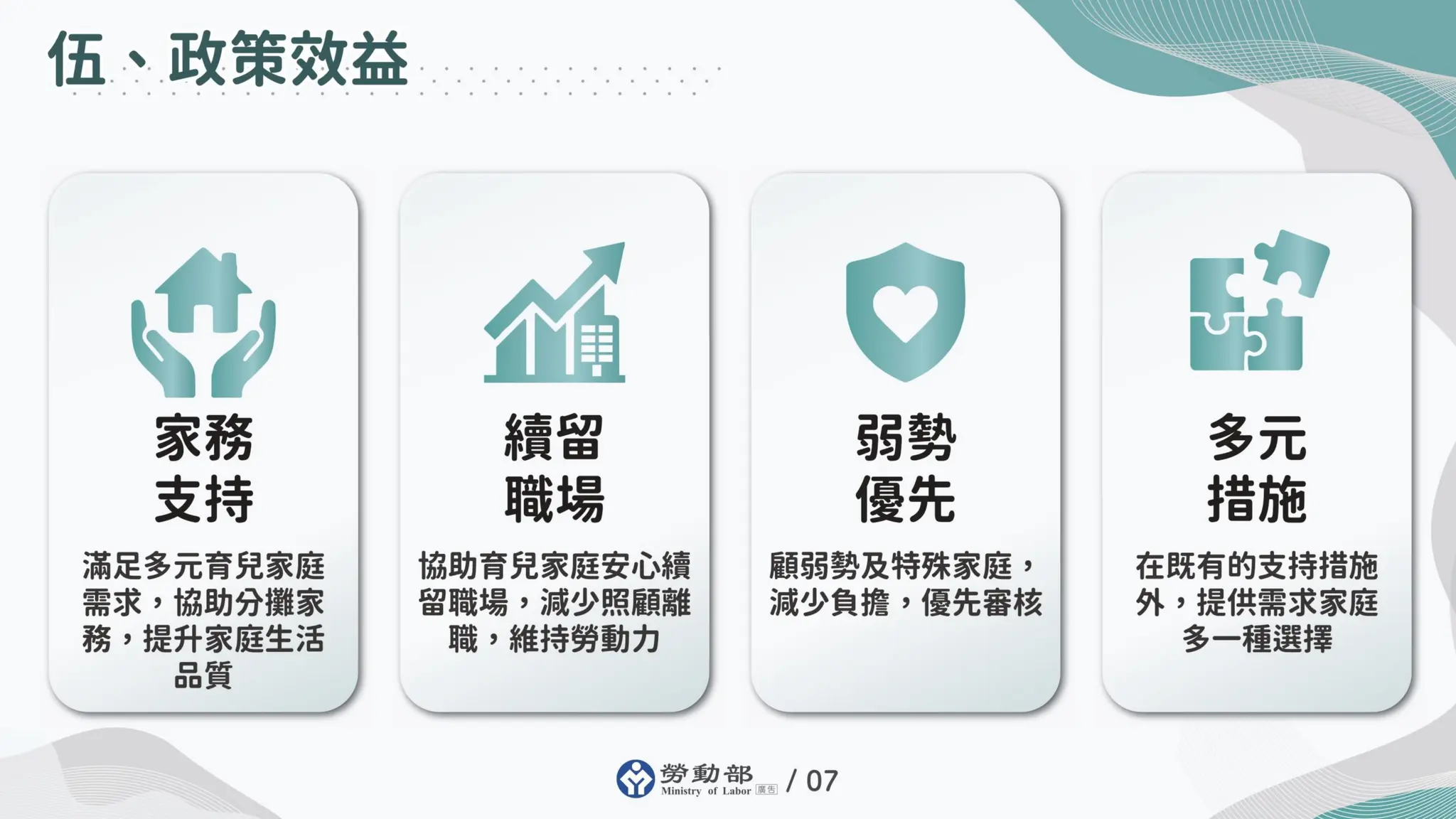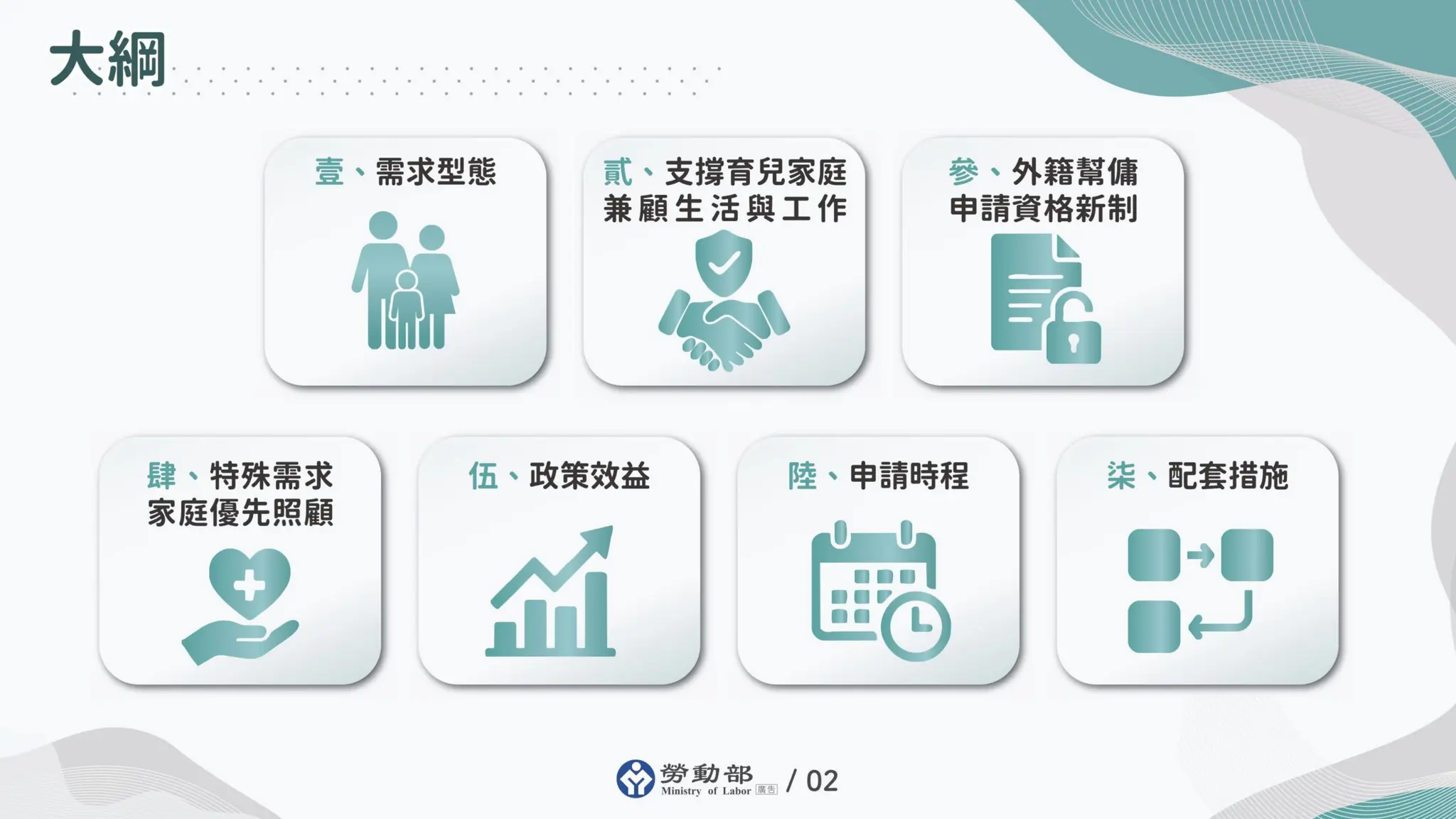 勞動部指出,隨著雙薪家庭比例提高,不少家長在工作、家務與育兒之間承受相當壓力,特別是需照顧幼兒或家有罕見疾病、身心障礙或發展遲緩兒童等特殊需求的家庭,更需要家庭支持。為回應實際需求,勞動部推動新制,調整外籍幫傭申請資格門檻,每個育兒家庭只要有1名未滿12歲兒童即可申請,至多申請1名外籍幫傭,讓更多家庭能在家務協助方面獲得支持。 勞動部強調外籍家庭幫傭制度並非取代既有托育或照顧措施,而是在既有托育、家事服務與社會支持資源之外,提供育兒家庭多一種協助家務的選擇。其次,外籍家庭幫傭的角色為輔助性家務幫手,主要協助家庭處理日常家務工作,並非保母或其他專業照顧人員,不會取代專業托育與照顧服務體系。為順利推動新制、協助弱勢及特殊需求家庭,勞動部同時規劃相關配套措施如下: 一、減輕弱勢及特殊需求育兒家庭負擔:透過減收就業安定費、簡化行政審查作業,優先協助具急迫照顧需求的弱勢及特殊需求家庭取得外籍家庭幫傭許可,以強化家庭照顧支持,減輕家庭經濟壓力。 二、確保家務工作品質:為確保外籍家庭幫傭服務品質,本部與衛福部共同合作,規劃幫傭需先經過相關家務基本訓練,及提供照顧基本知能培訓;另外為協助家庭照顧年幼子女,衛福部也將擴大推動育兒指導員到宅指導服務技巧,協助家長提升照顧技巧,擴大整體效益。 三、兼顧本國勞工權益:同步推動相關配套措施,包括擴大育兒指導員工作機會、強化托育與家事服務媒合平台功能,並提供本國勞工就業與技能協助,如推動專案就業媒合、就業獎勵措施,以及協助勞工提升專業工作技能,並提供職業訓練生活津貼等支持方案,以擴大本國相關從業人員的就業機會與提升勞動權益。 勞動部表示,為順利推動新制,將儘速完成相關法規修正、申請書表調整、資訊系統更新及各項配套措施整備,預計於4月13日起,有家庭幫傭需求的家庭完成國內求才,將開放受理申請外籍幫傭招募許可。未來也將持續觀察政策推動情形,適時檢討與精進,協助勞工兼顧家庭與工作責任,提升勞動參與率,讓勞工得以安心留任職場。 業務單位:勞動力發展署 發布單位:新聞聯絡室 https://www.ey.gov.tw/Page/9277F759E41CCD91/c1746341-6010-4671-926b-67941ac2c50d